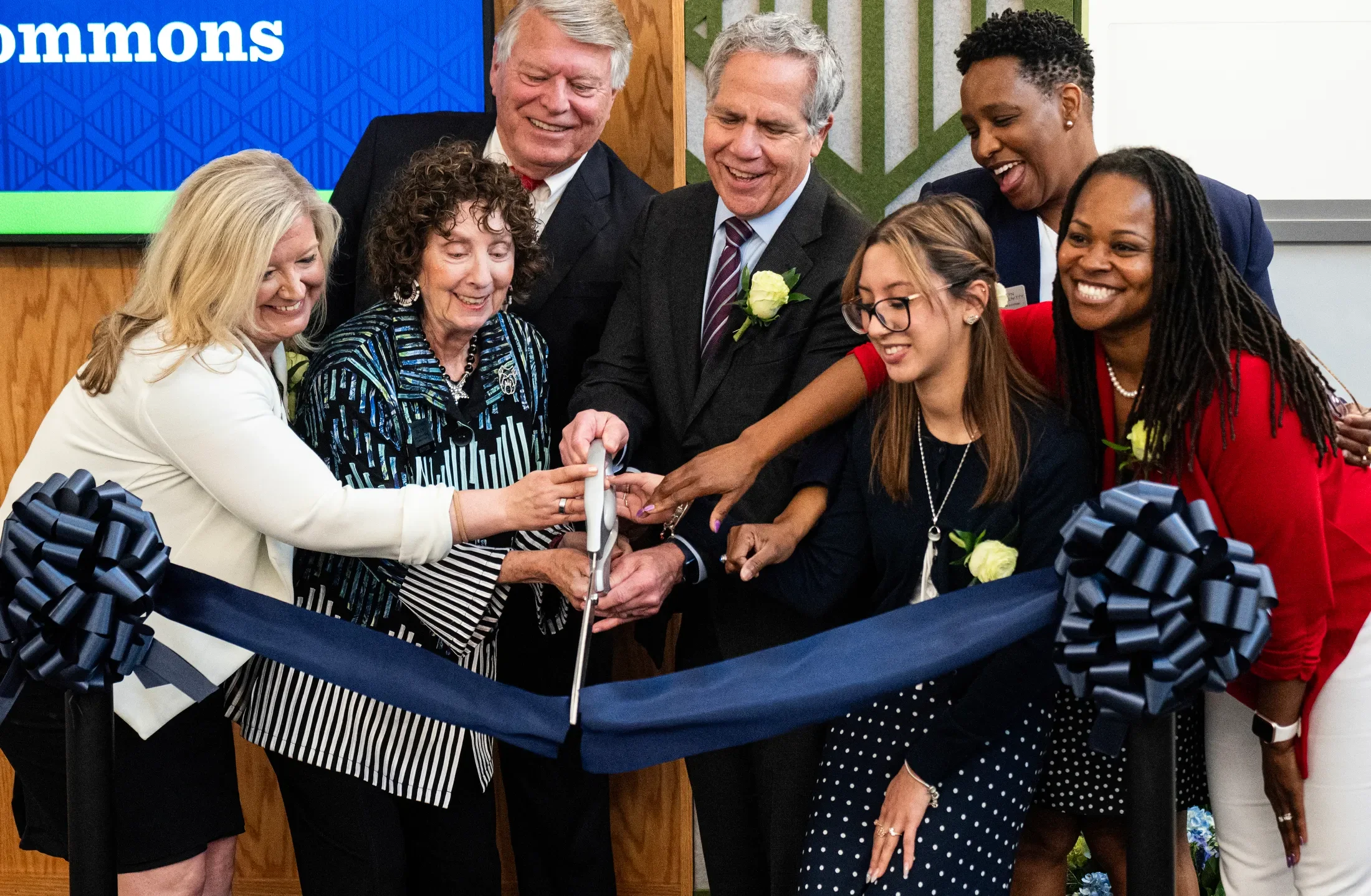 The ribbon cutting ceremony at Founder’s College, featuring Associate VP for Transformation Stephanie Hinshaw (far left), Butler President Jim Danko (center), and Founding Dean Carolyn Gentle-Genitty (second from right).